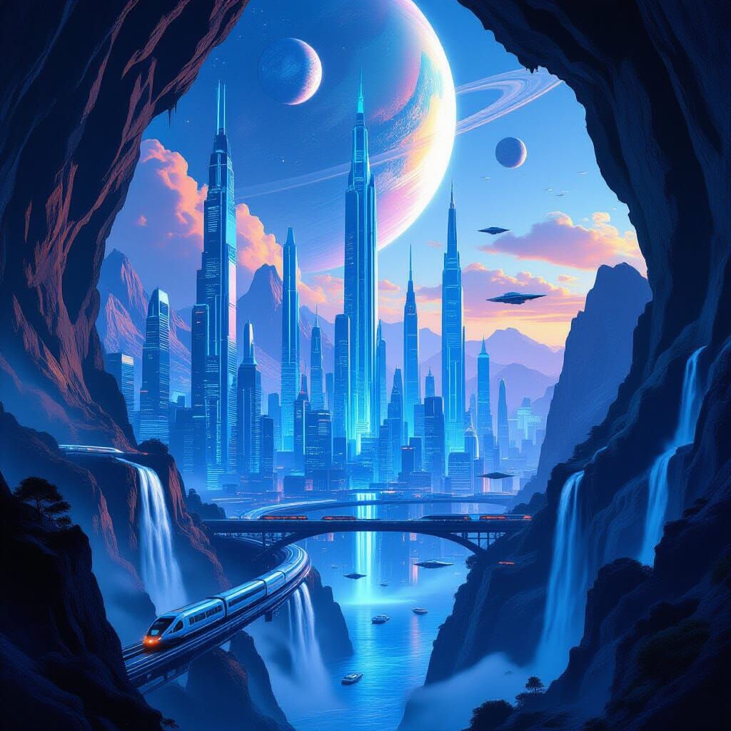 un paisaje urbano futurista, panorámico y cinematográfico con rascacielos altos y elegantes que reflejan un tono azul neón, intercalados con cascadas que caen desde montañas imponentes. La ciudad está atravesada por trenes y vehículos voladores, bajo un cielo crepuscular donde se ven planetas y un anillo ...