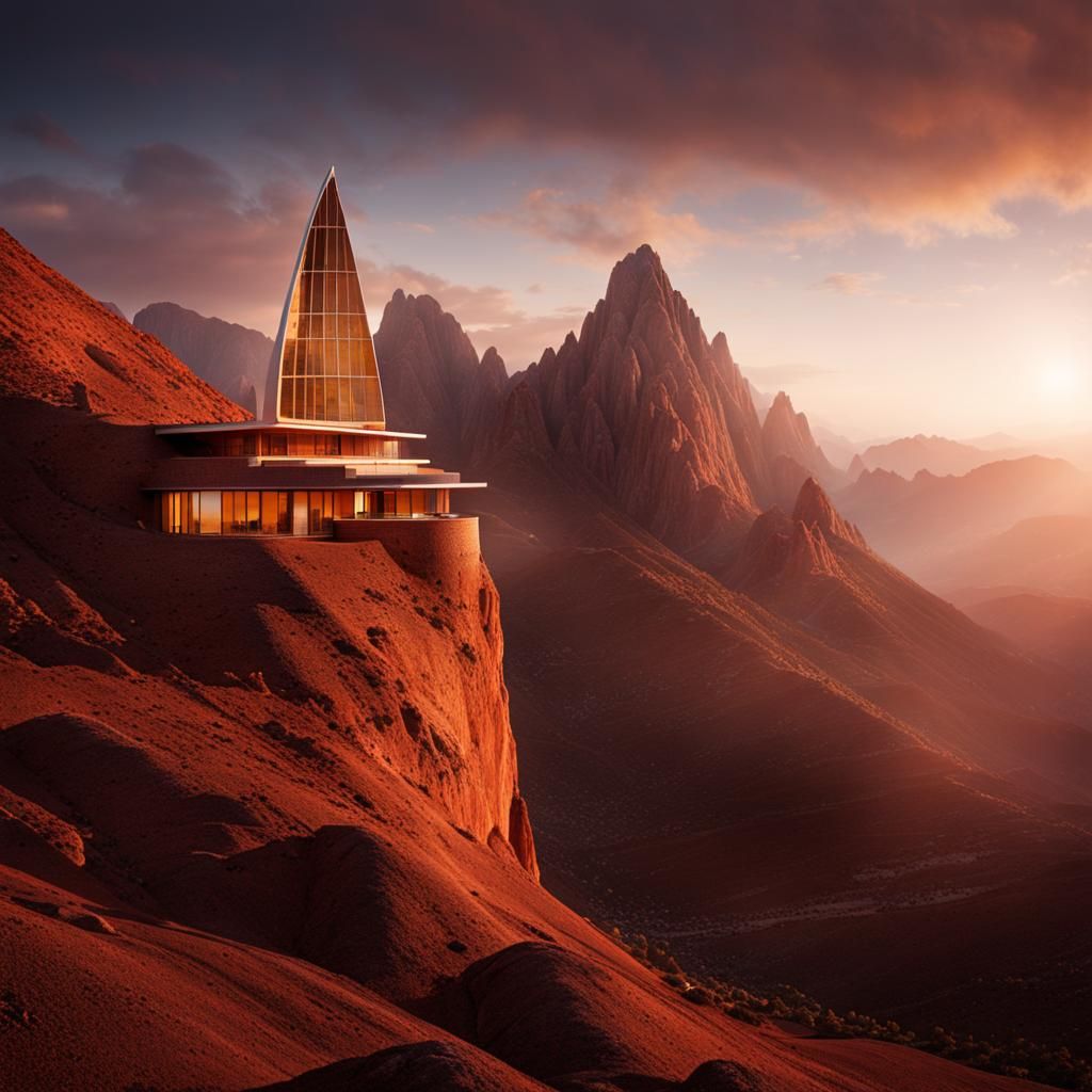 This image shows the House of Wind carved into a red mountain, glowing with golden light at night. Balconies and glass doors lead to dining and living spaces.