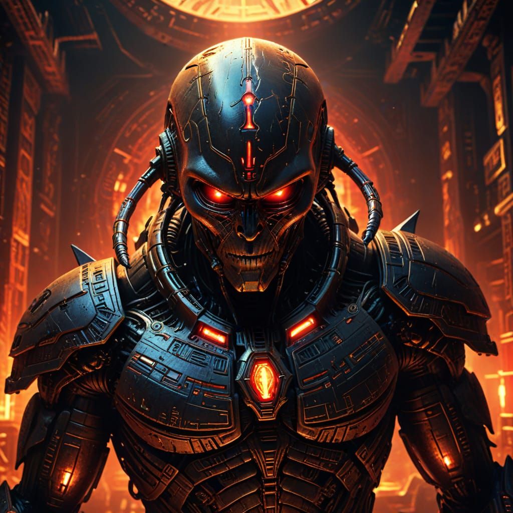This image shows an alien reactor titan inside a spaceship. The scene features ominous red lighting, Egyptian hieroglyphs, black metal ornaments, and golden accents in a dark sci-fi aesthetic.