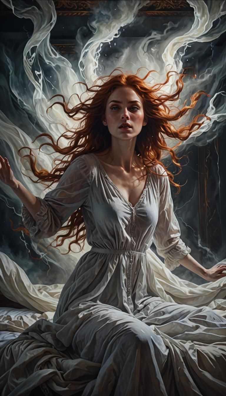 This image shows a beautiful auburn-haired woman floating above a bed. The scene is painted with stormy swirls and flowing lines in a dark fantasy art style, enhanced by god rays and deep complementary colors.