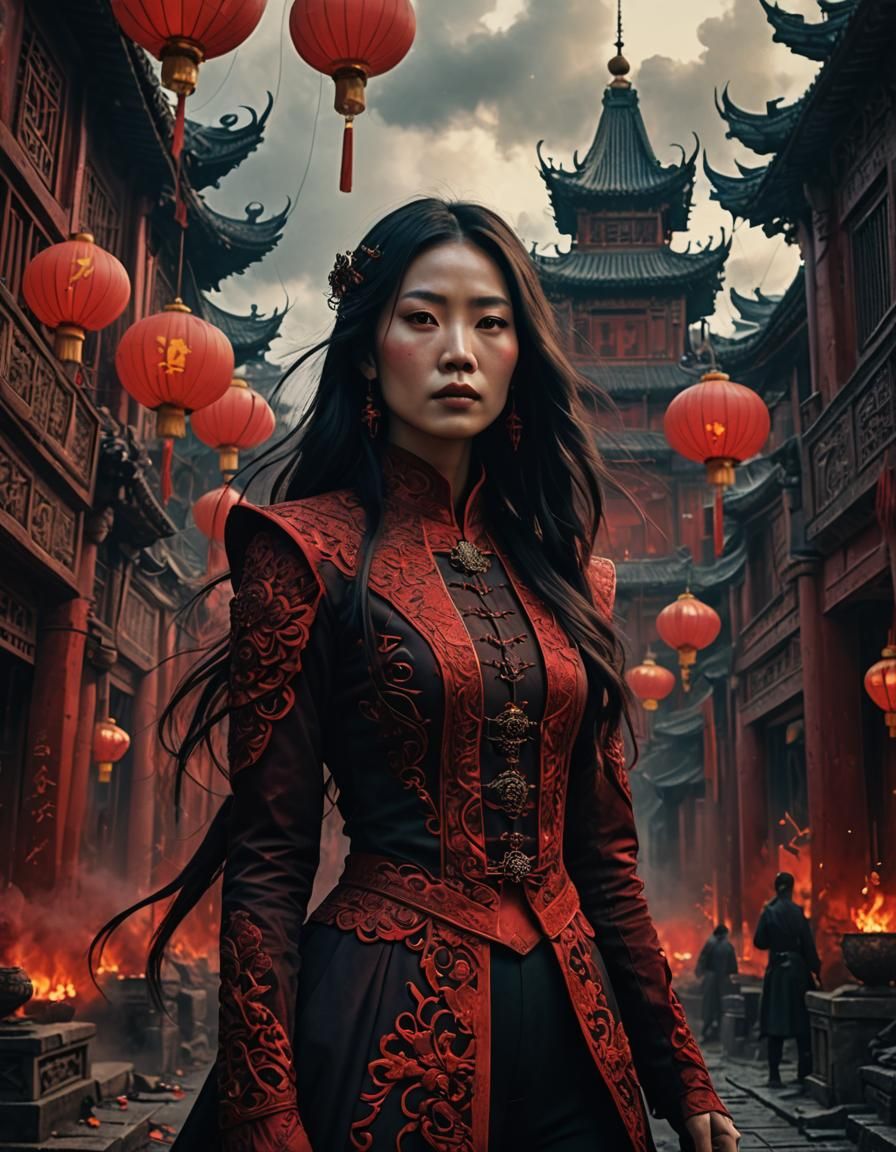 A striking picture of a 30-year-old Chinese woman in red gothic attire. The image evokes a dark, dramatic, and cinematic atmosphere with rich textures and golden lighting, in a maximalist digital painting style.