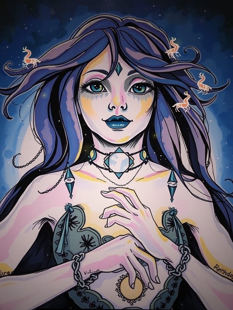 Easily generate your own ethereal watercolor images of mystical women with flowing hair and glowing runes for free.