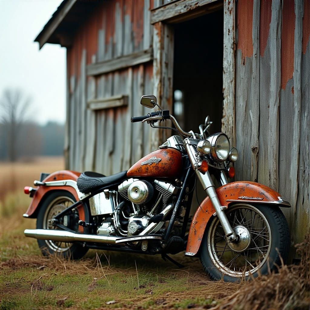 This image captures a weathered motorcycle leaning against a worn wooden shack, blending seamlessly with the surrounding landscape in muted, earthy tones, with a focus on the intricate details and high-contrast textures reminiscent of black-and-white landscapes.