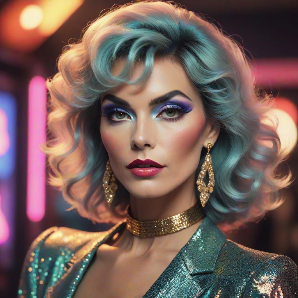 This image shows a slender, vintage cross-dresser from the early 80s in a new wave style. The vivid fashion photography features neon lights and a retro aesthetic, with makeup and skin tones providing a warm glow.
