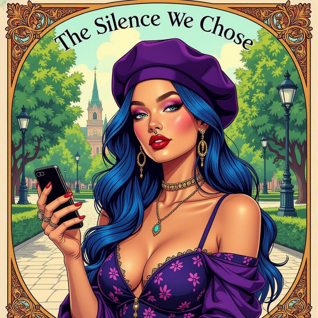 A striking picture of a supermodel with blue hair in a cyberpunk setting. The image blends graphic novel aesthetics with detailed illustration and art deco influences, creating a uniquely atmospheric composition.