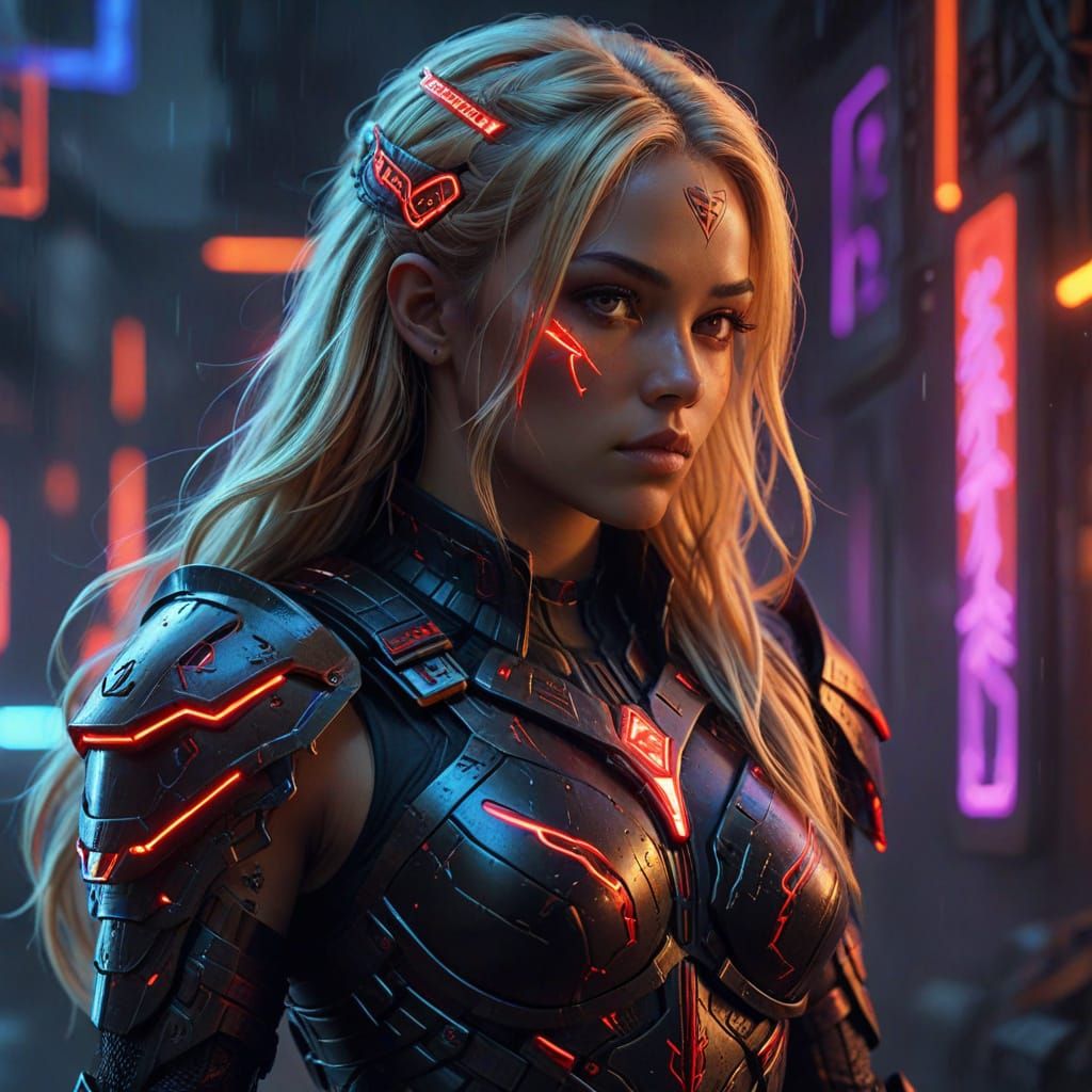 This image showcases a strong woman in a cyberpunk setting, clad in intricate black and red armor with glowing runes and surrounded by neon lights and ethereal elements, exuding confidence and mystique.