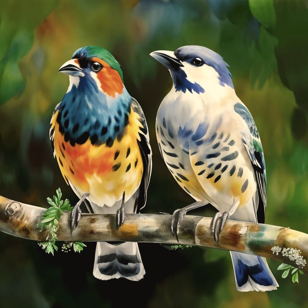 This image showcases a mated pair of birds, with a colorful male and a gray female, set against a native habitat background, blending photorealism with a touch of Impressionist watercolor style.