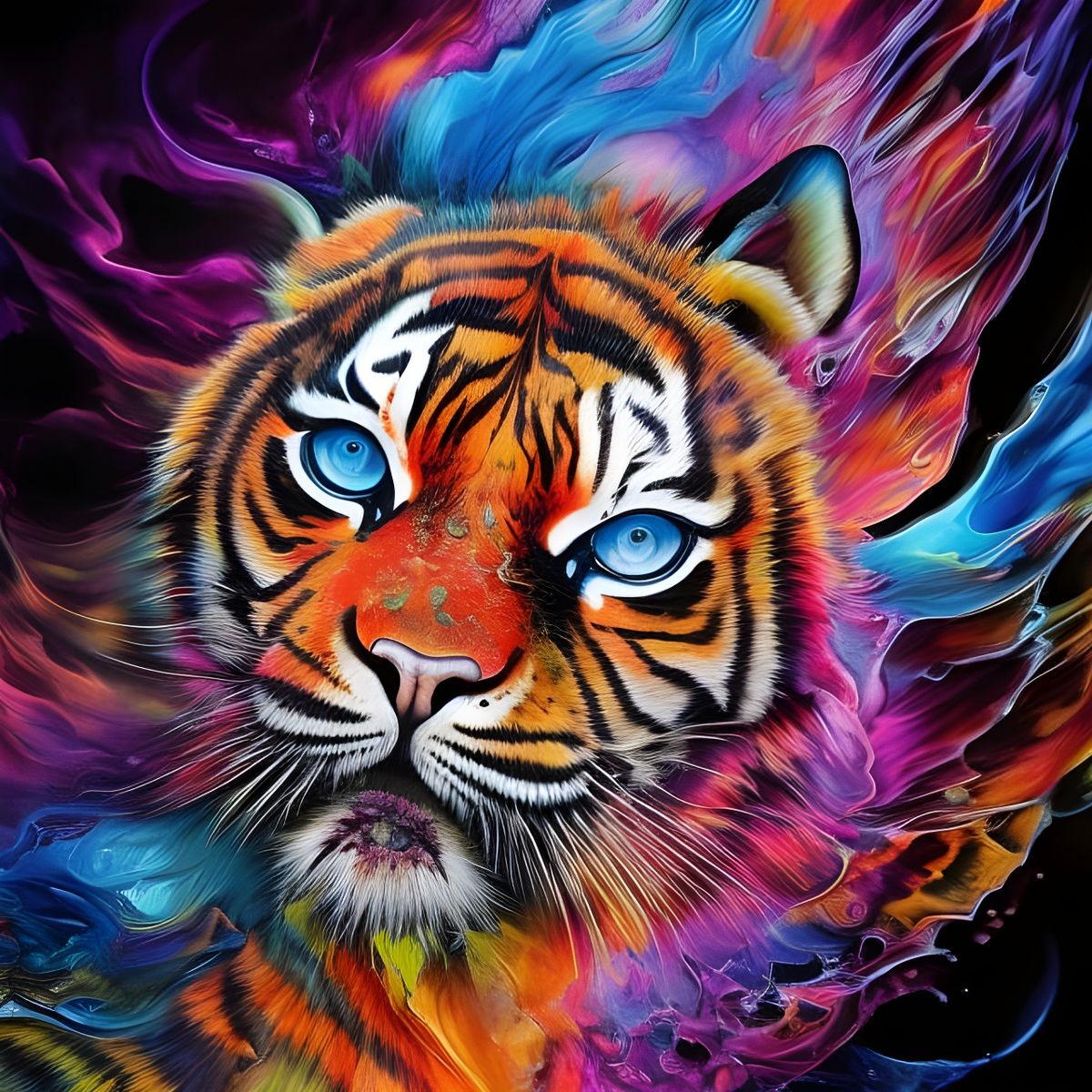 Tiger: colorful ink flow: 8k resolution photorealistic masterpiece: by Aaron Horkey and Jeremy Mann: intricately detailed fluid gouache painting: by yoshitaka Amano: calligraphy: acrylic: watercolor art, professional photography, natural lighting, volumetric lighting maximalist photoillustration: by ...