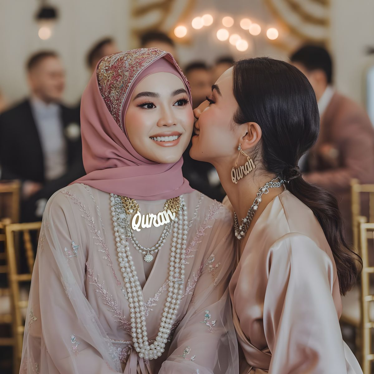 This image shows an Asian woman in a sheer dress and hijab, adorned with pearl body chain and Quran-themed jewelry, sharing a kiss with her bridesmaid. The soft, romantic portrait captures the joy of a warmly lit wedding party.