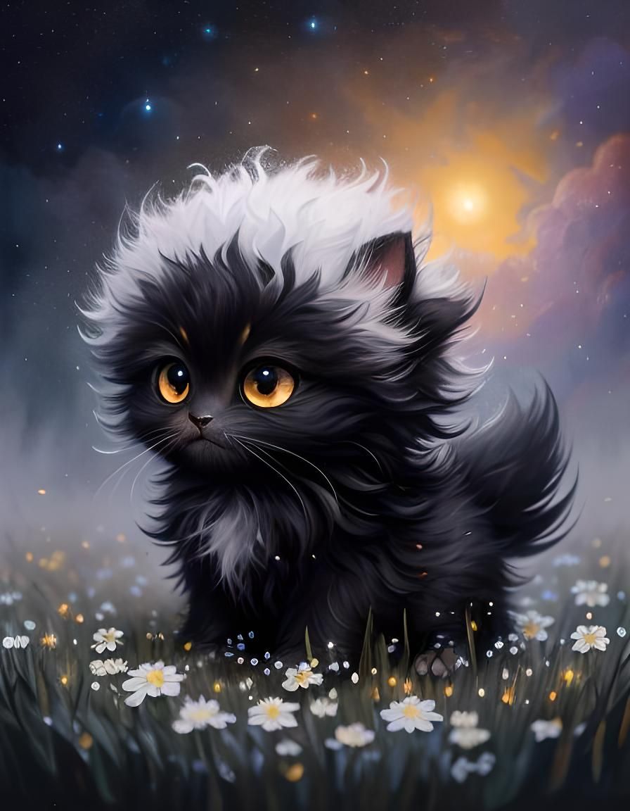 A close-up image shows a tiny, fluffy fantasy creature with big eyes playing in a flower rain. This highly detailed oil painting features swirling black and white fur under a starry sunset sky.