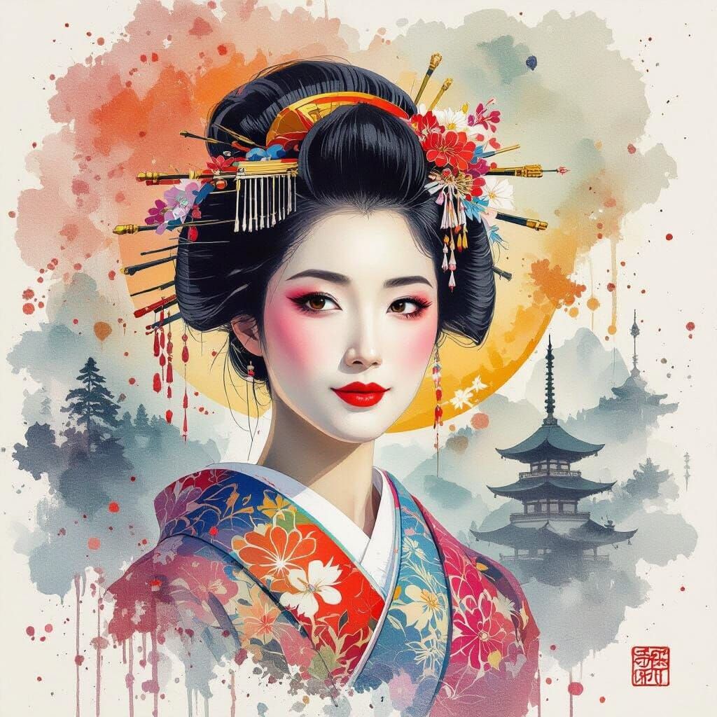 This image depicts the Swiss Alps infused with traditional Japanese cultural elements. Painted in a dynamic, vibrant, and painterly style with impasto highlights, it features a visually striking composition.