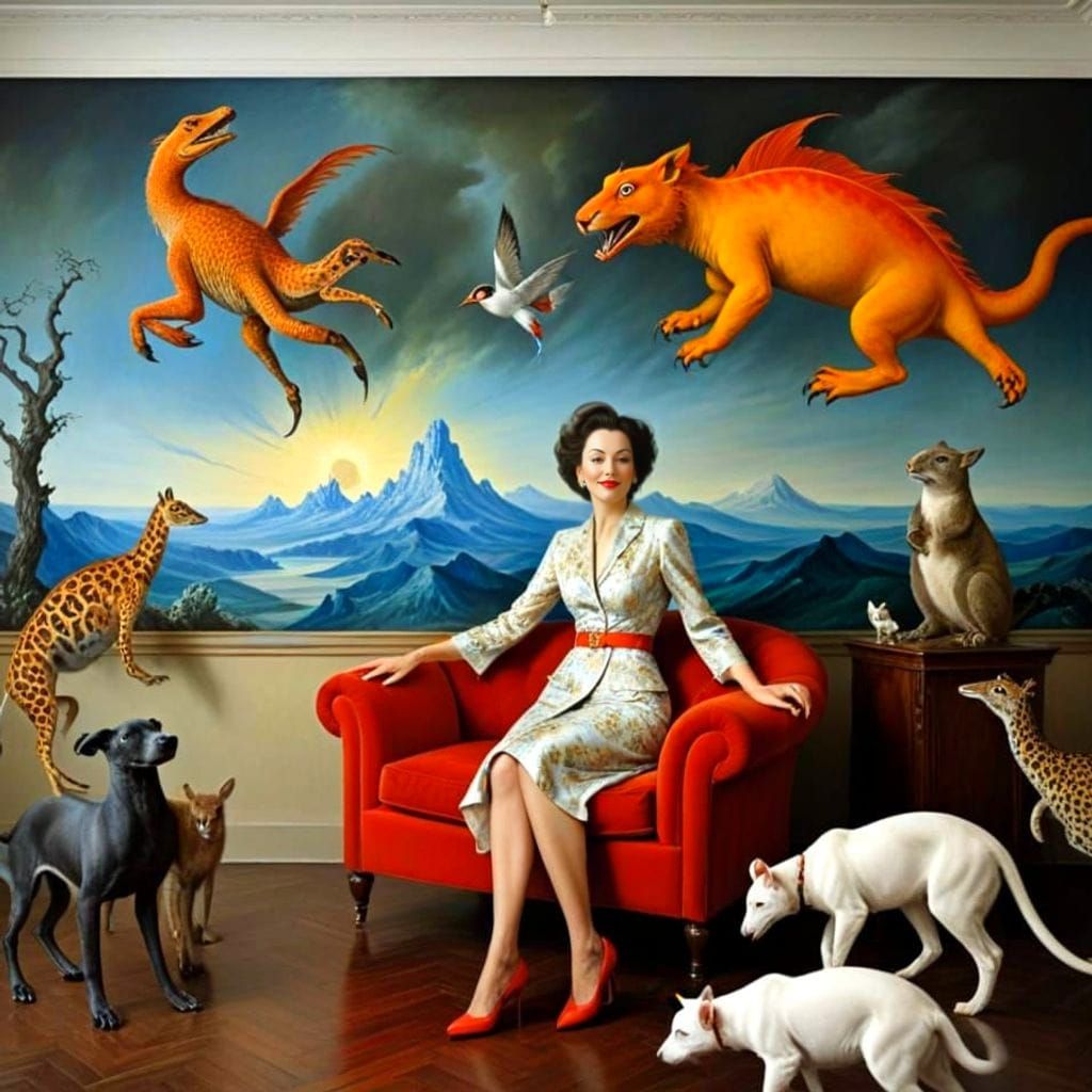 photorealistic full-height view of happy magnetic middle-aged lady in tasteful classy colorful outfit, easy natural graceful posture, with weird harmless fictional animals in complex asymmetric fantastic surrealistic scene by Catrin Welz-Stein, Dorothea Tanning, Evandro Schiavone, Salvador Dali, Ithell ...