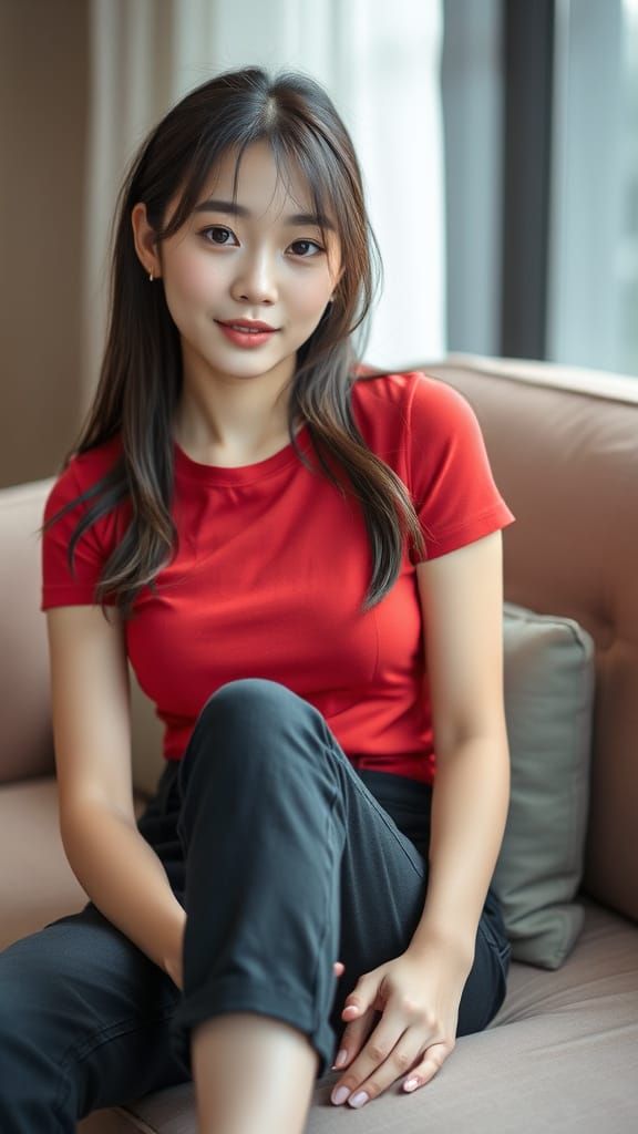 A digital portrait of a beautiful young Korean woman with pale skin. She is sitting on a sofa wearing a red t-shirt and black jeans in this AI generated image.