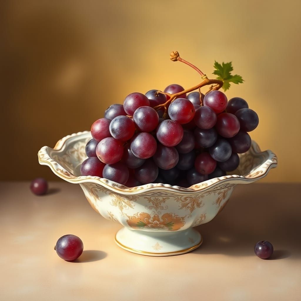 A striking picture of ripe grapes nestled in a Victorian-era porcelain dish. The arrangement is softly lit, with subtle shadows enhancing the three-dimensional effect in hyper-detailed realism.