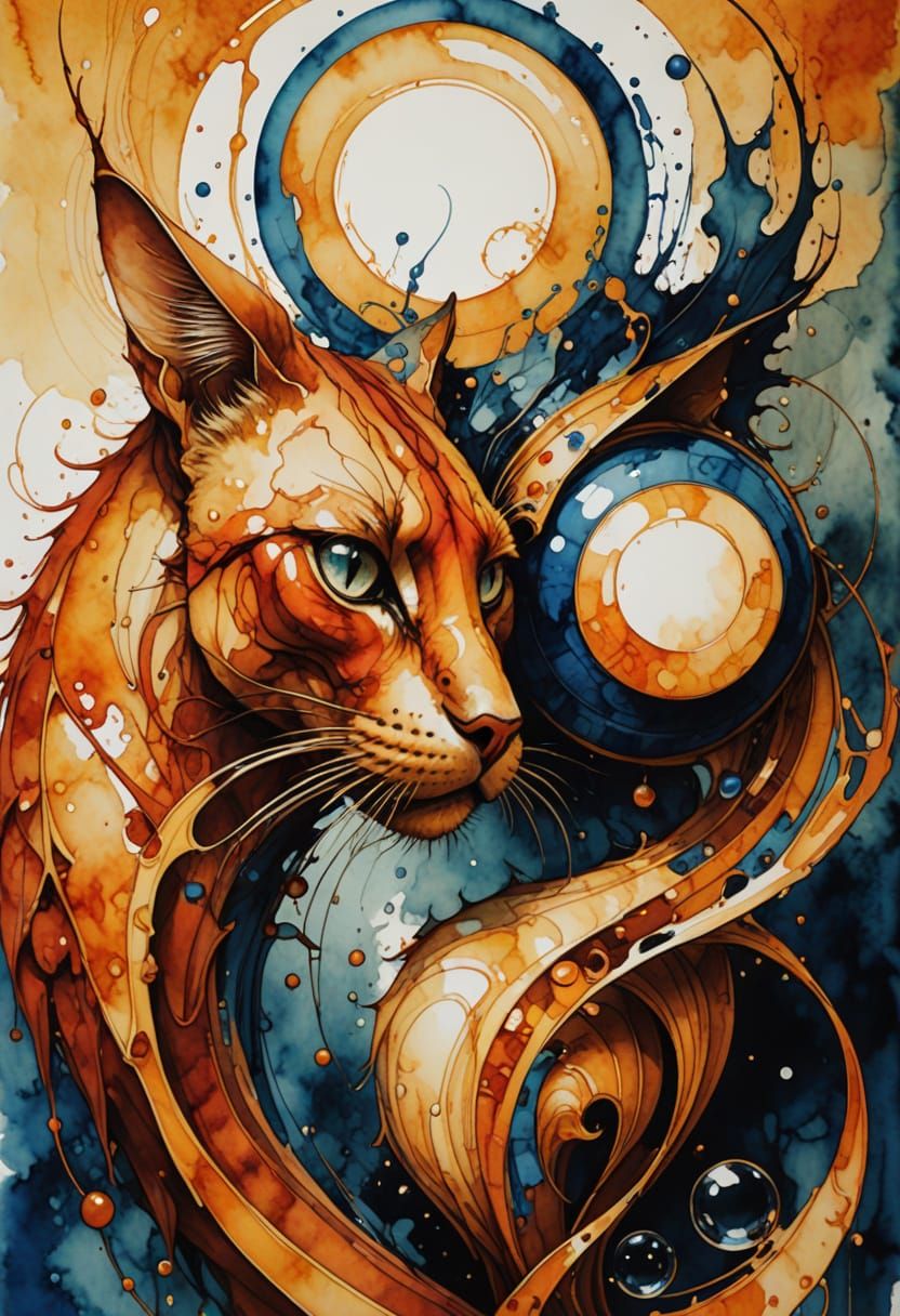 A surreal illustration of a cat with exaggerated features in a mystical forest. The artwork features asymmetric patterns of orange, red, gold, and blue in a neo-impressionist style with art deco elements.