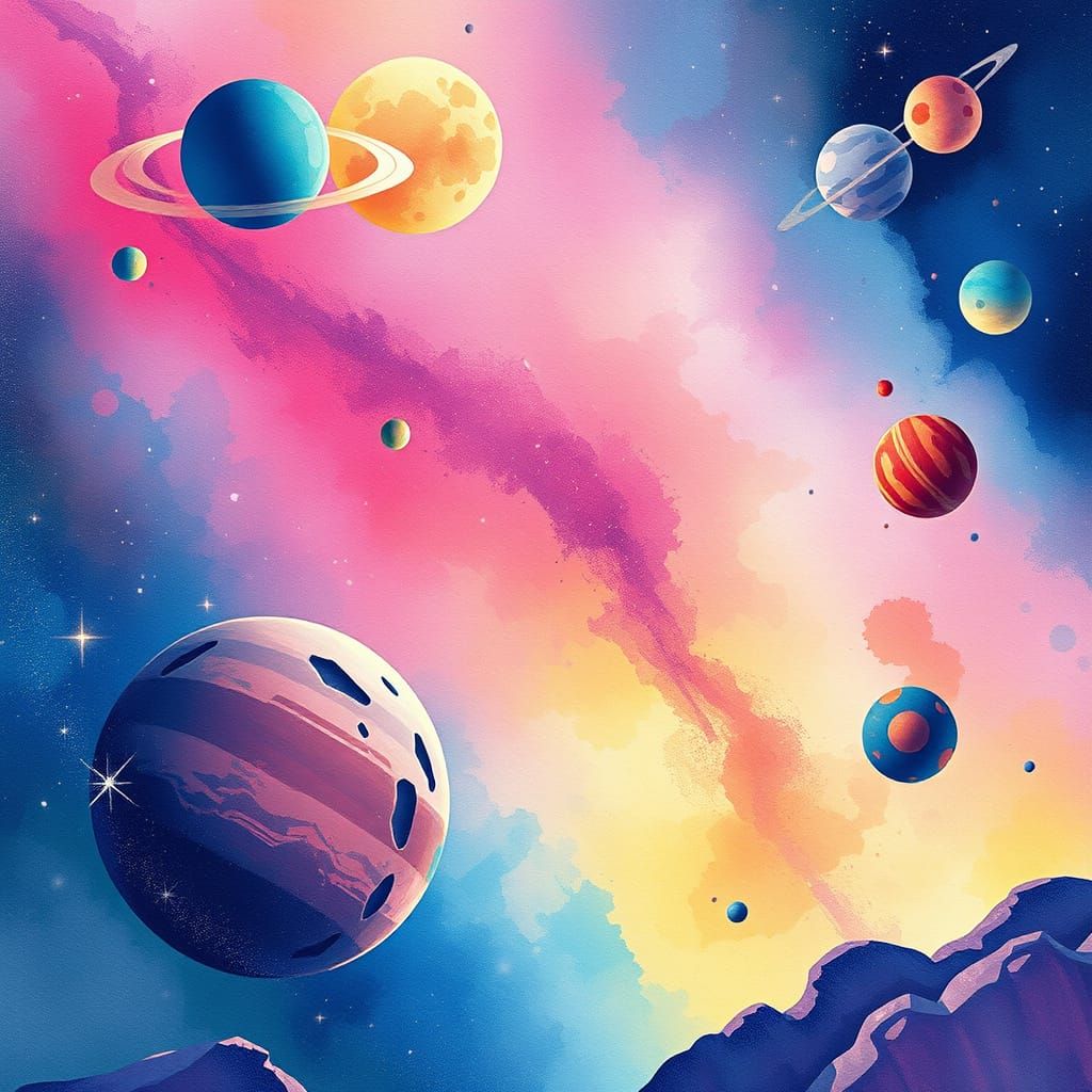 A vibrant galaxy scene featuring planets and asteroids is depicted using soft watercolor textures. The image has a dreamy, liminal atmosphere with expressive brushstrokes in a playful style.