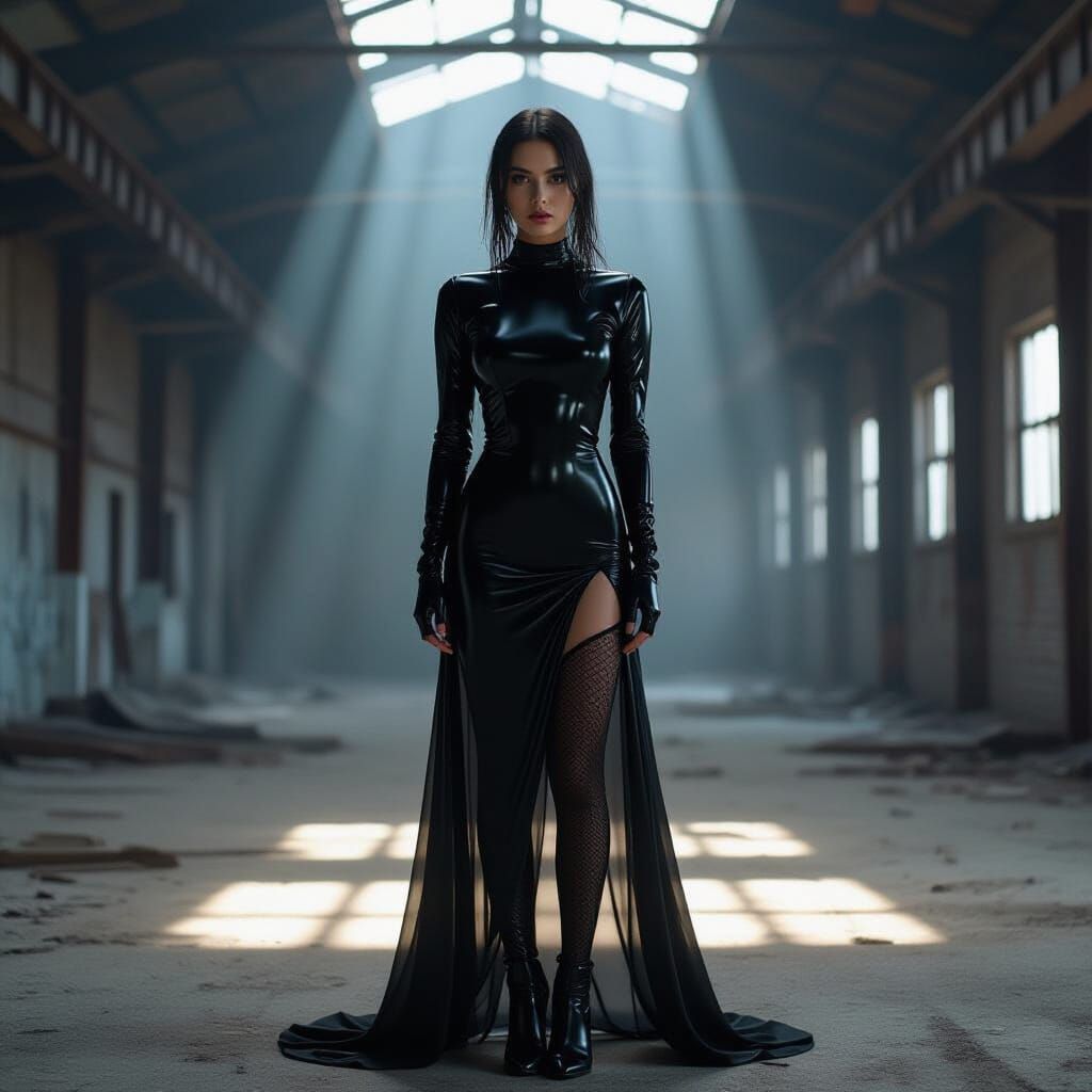 This image shows a woman in a warehouse bathed in soft light. She is wearing a black bodysuit and patterned tights in a dark futurist style with highly textured detail.