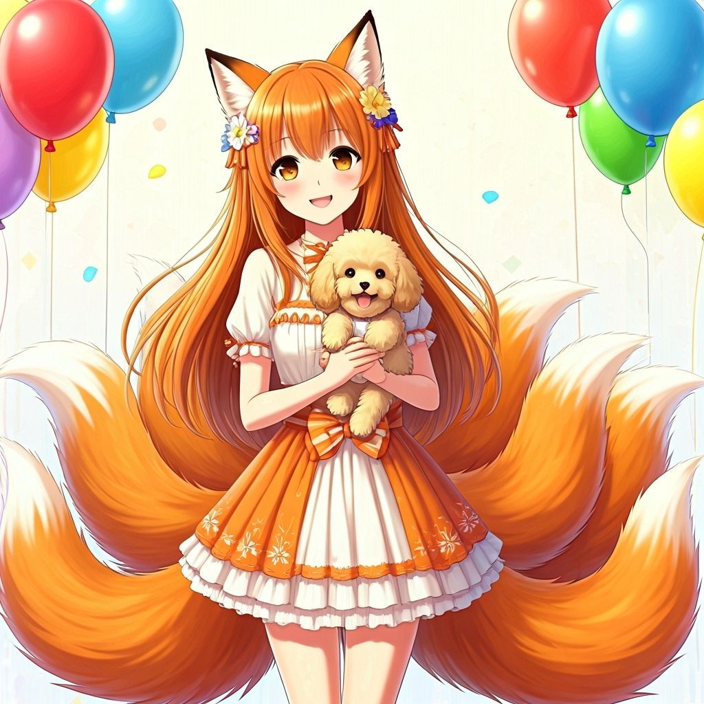 This image shows a smiling anime fox girl with seven tails holding a cockapoo puppy at her birthday party. Rainbow balloons and confetti decorate the scene in this anime key visual.