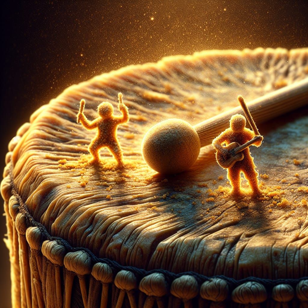 This image shows a close-up of an old drum with drumsticks. Two tiny, radiant figures dance on the drum's surface. The image features dramatic lighting and a rich depth of field.