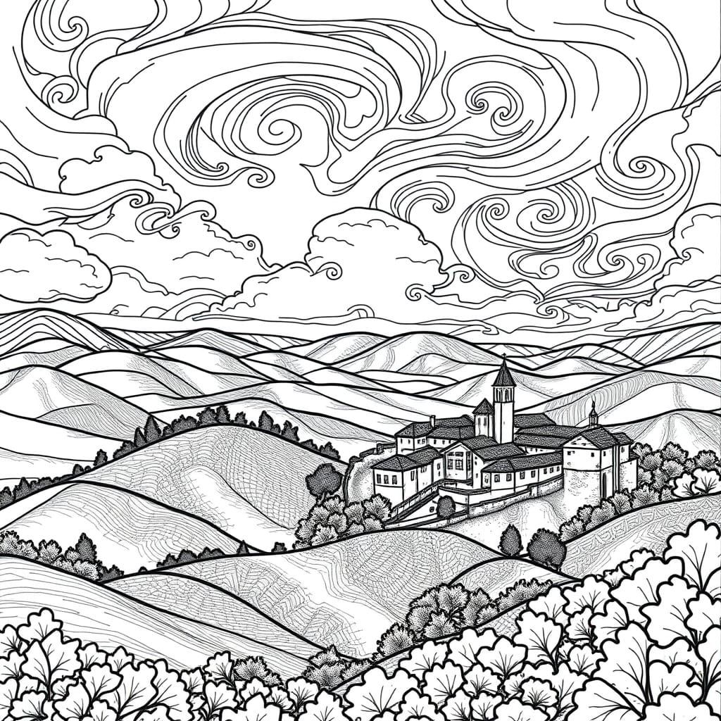 This detailed black and white line art features a Croatian landscape with rolling hills and medieval buildings under a dramatic, swirling cloud sky, perfect for adult coloring books.