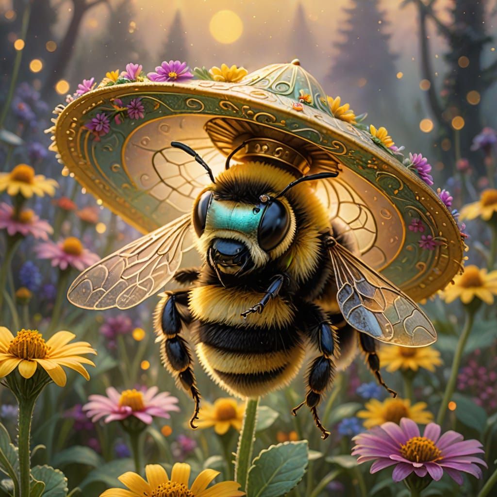 A close-up image of a bumble bee wearing a sombrero, set against a backdrop of vibrant flowers. The artwork, reminiscent of Kinkade, features soft, glowing light and intricate, dreamy details.