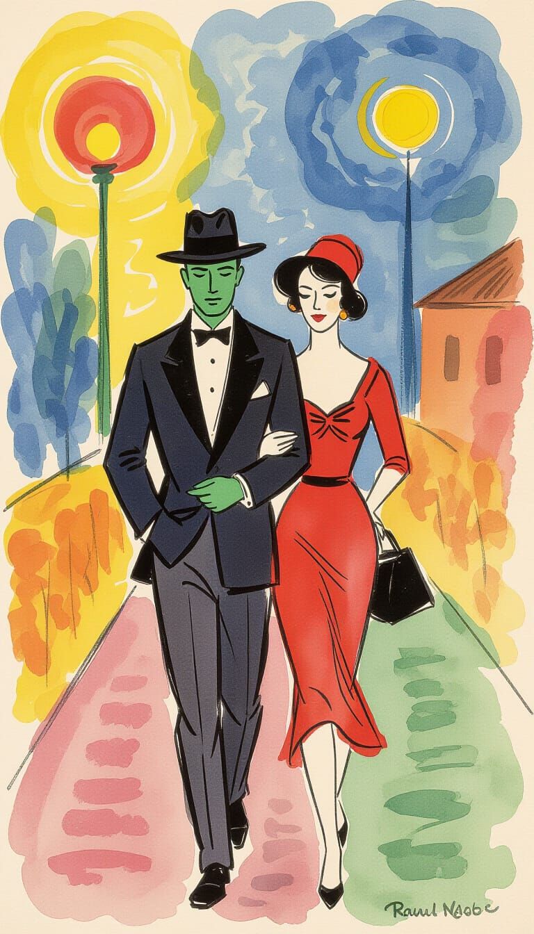 Raoul Dufy + Emil Nolde + Fauvism. Dufy's calligraphic ink lines dance across wet watercolor fields with dynamic separation between drawing and color, Nolde's fearless saturation produces luminous chromatic intensity through bold adjacencies of unmixed pigments, and Fauvism infuses liberated color joy. ...