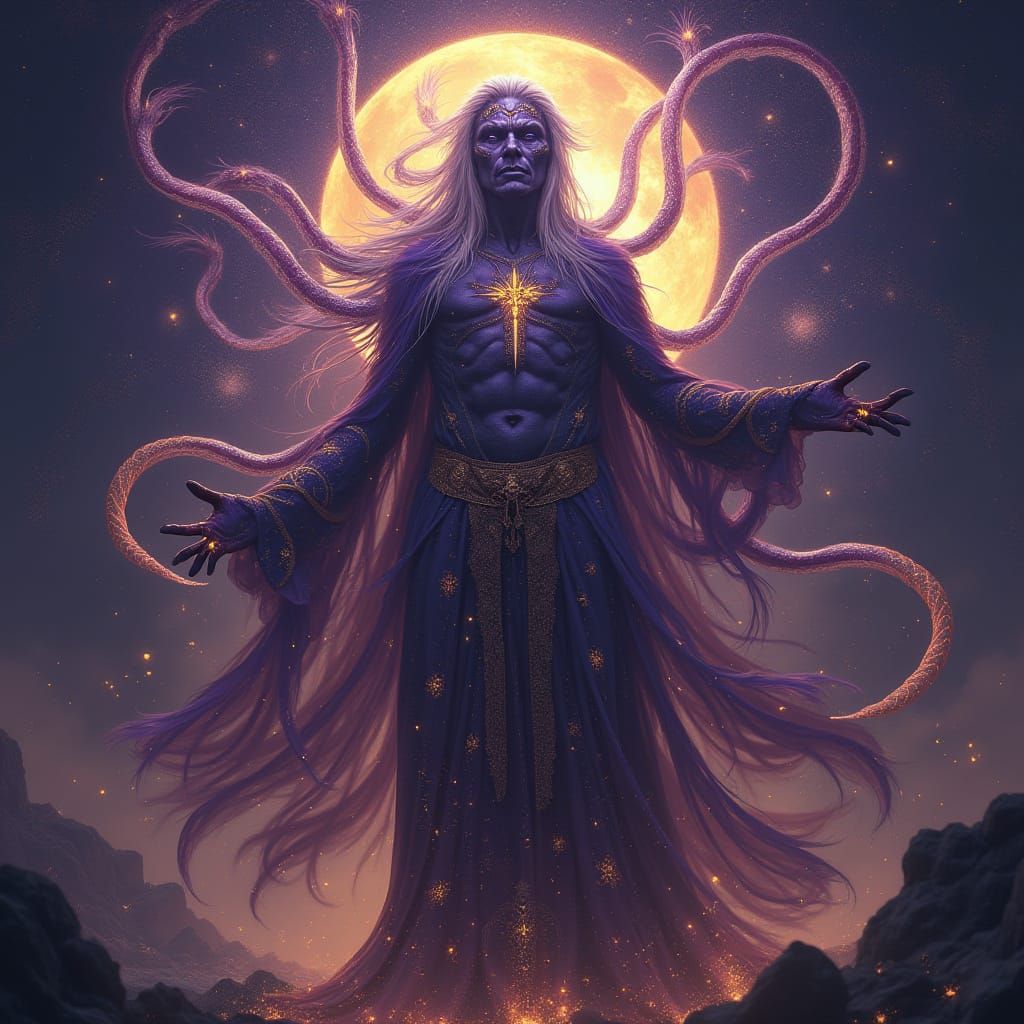 This image depicts a majestic, ageless deity with dark, glowing skin adorned with celestial patterns, surrounded by divine serpents and sacred Vodou symbols, set against a backdrop of vibrant, otherworldly lighting, evoking the mysteries of the cosmos.