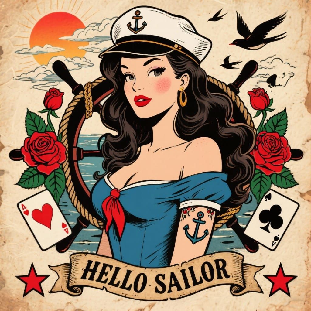 Design your own unique vintage sailor pin-up tattoo illustrations with our easy-to-use AI generator. Free to try!