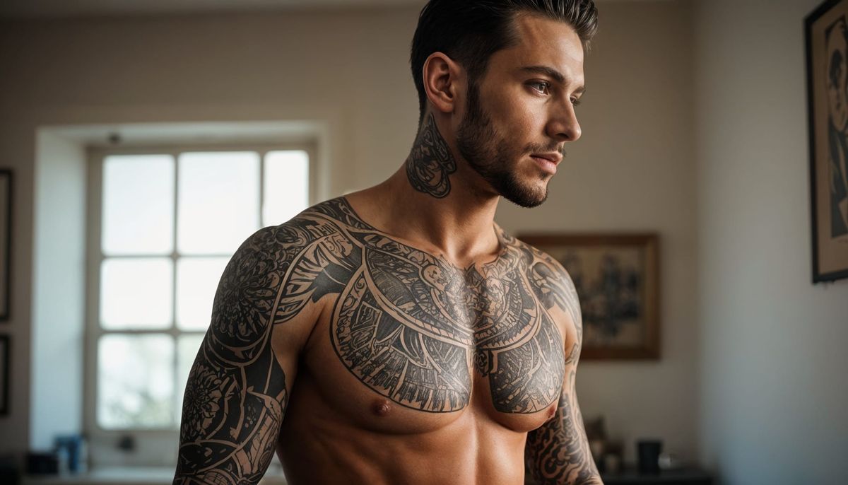 This image shows a tattooed man posing in a modern interior. The tattoos are intricate, dark gray and black. He is wearing a close-fitting, off-white athletic supporter, and the lighting is well-balanced.