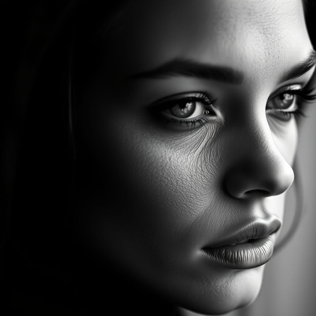 A high-contrast, ultra-detailed black and white portrait of a beautiful woman's face, evoking the moody intensity of classic documentary photography and the sumptuous textures of high-fashion art.