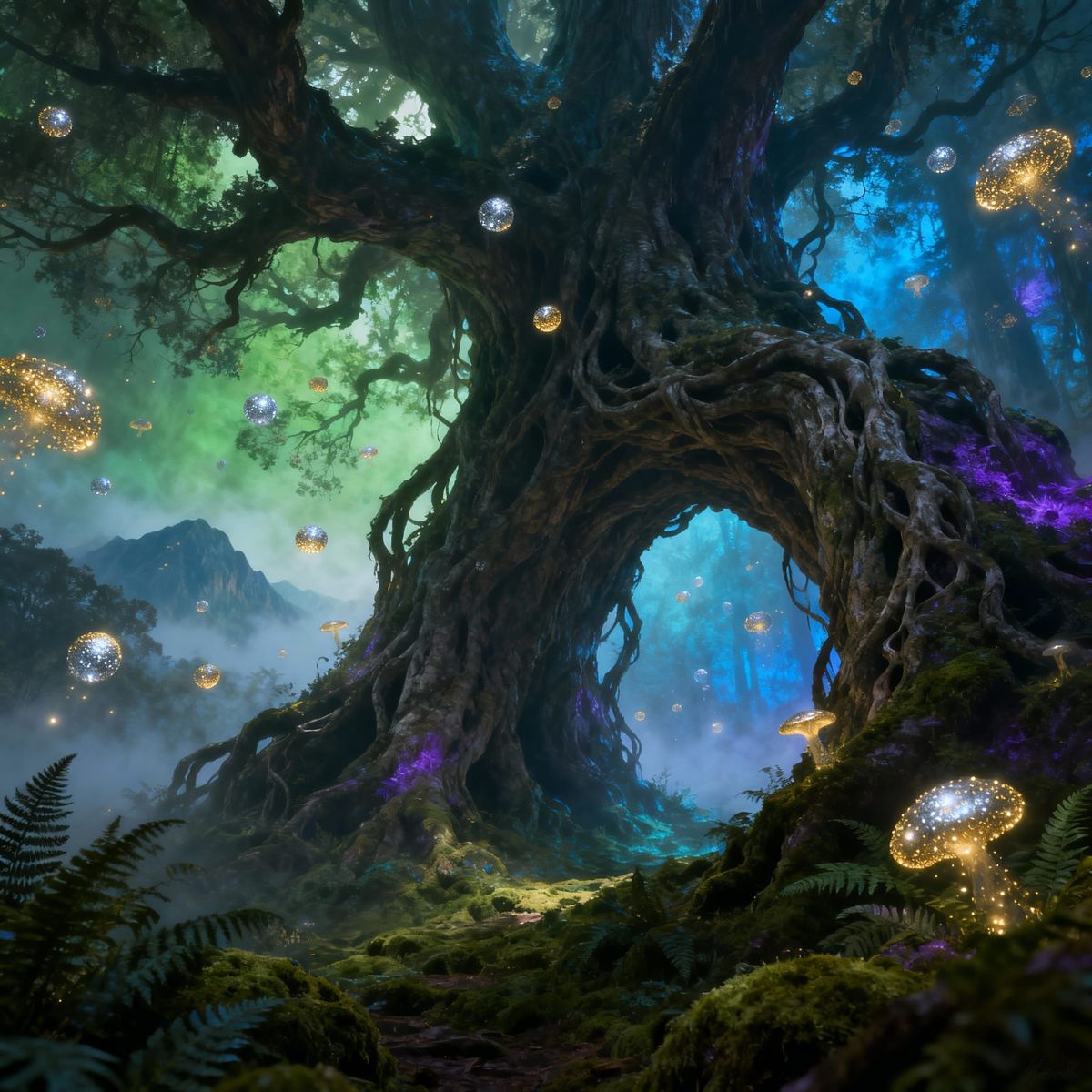 This epic fantasy concept art depicts a colossal ancient tree with roots forming natural archways in a misty forest. Luminescent spores illuminate the scene with atmospheric lighting and vivid colors.
