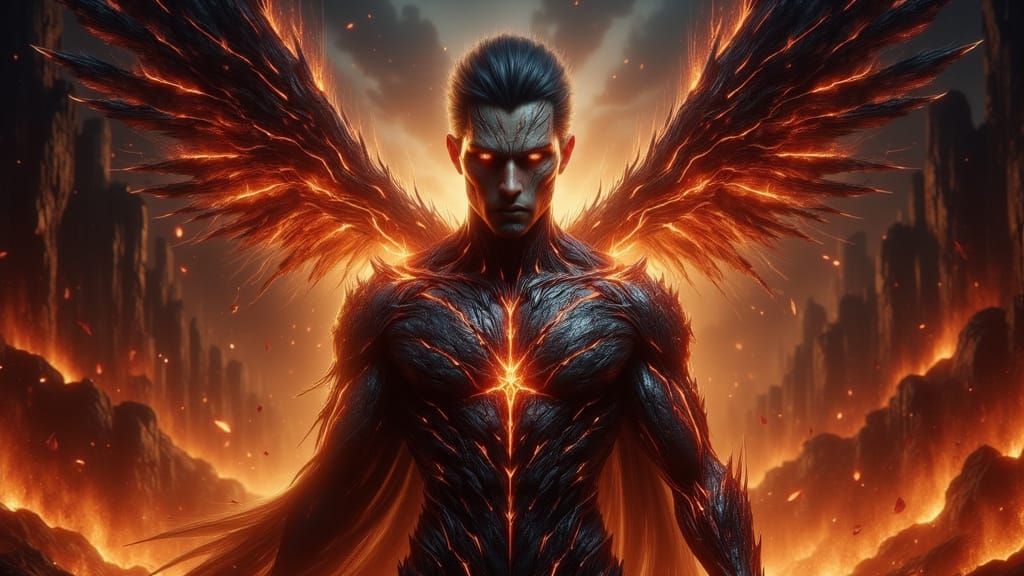A striking picture of a bronze-skinned, black-haired Korean elf in obsidian armor, standing against a volcanic backdrop. The elf's wings are made of fire and ash, 135mm lens, with intense warm lighting, smoke effects, and glowing particles in hyperdetailed photorealistic fantasy style.