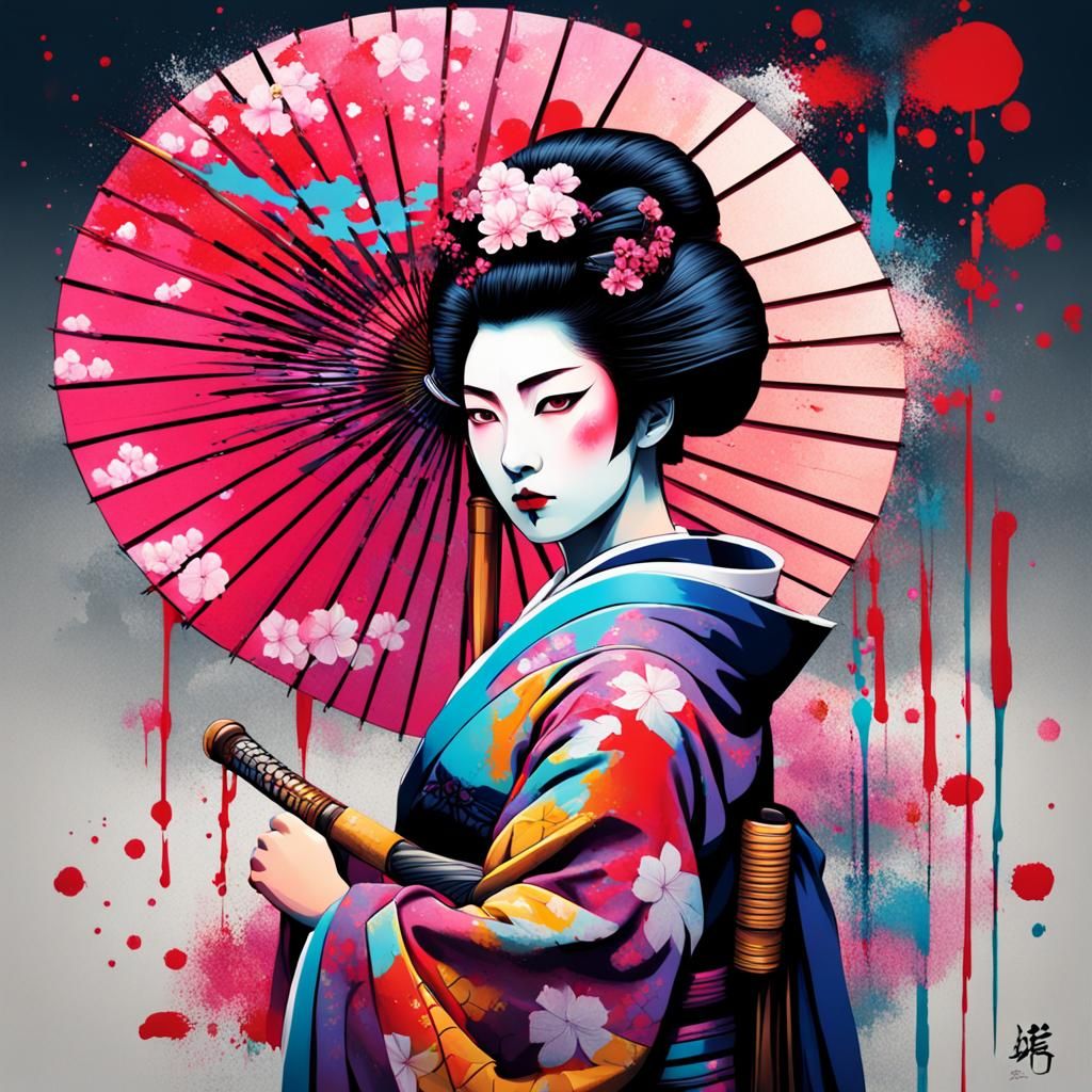 A vibrant graffiti artwork featuring a geisha, samurai warrior, Mount Fuji, and cherry blossoms. The image blends oil, gouache, and acrylic textures in a colorful, high-contrast style.