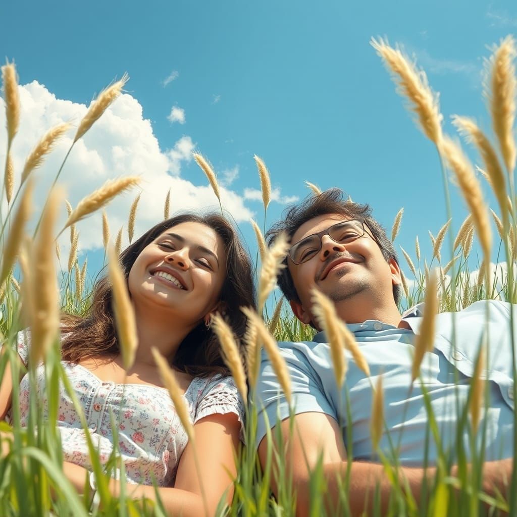A peaceful scene of a smiling woman and a relaxed man lying together in a grassy field. The image evokes the style of dreamy impressionist landscapes with vivid colors and textures.