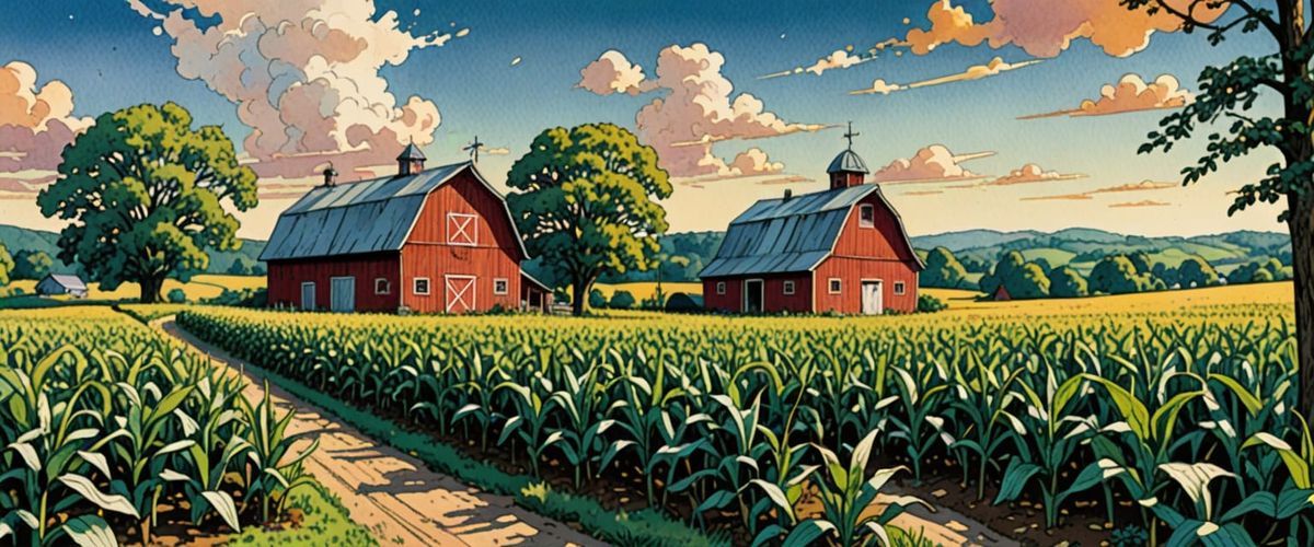 This image depicts a cheerful farmhouse and barn adorned with Pennsylvania Dutch hex signs, set in a cornfield under bright, late afternoon sunlight. Rendered in a naive comic book style with watercolor and gouache textures.
