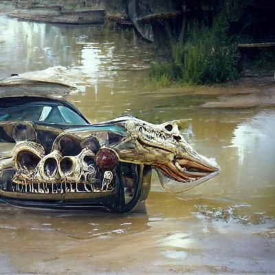 A striking picture of a crocodile skull modified into a car. The image is an oil painting in the style of a classical realist.
