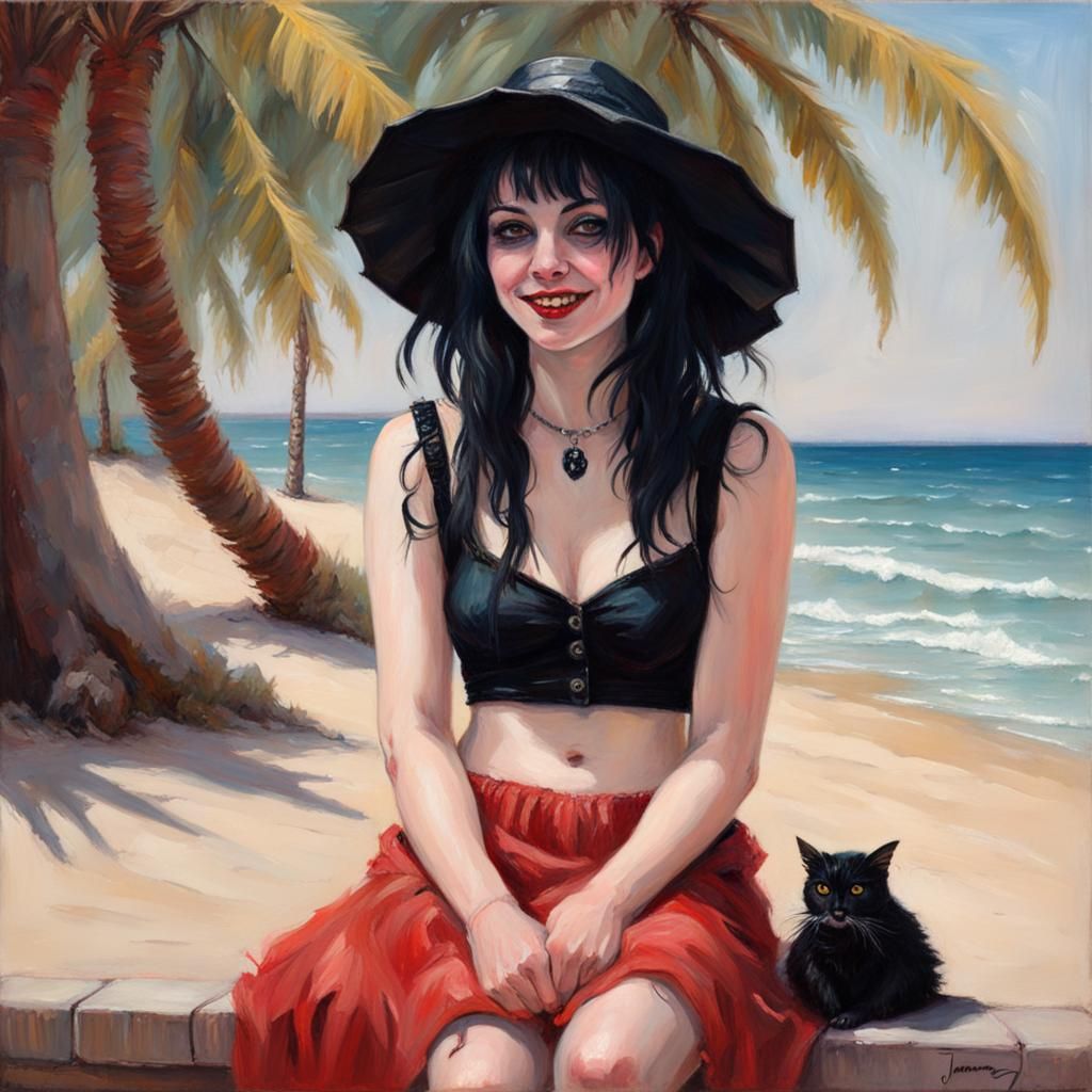 This image depicts a goth girl enjoying a vacation. The image is reminiscent of oil paintings, with rich colors and detailed brushwork.
