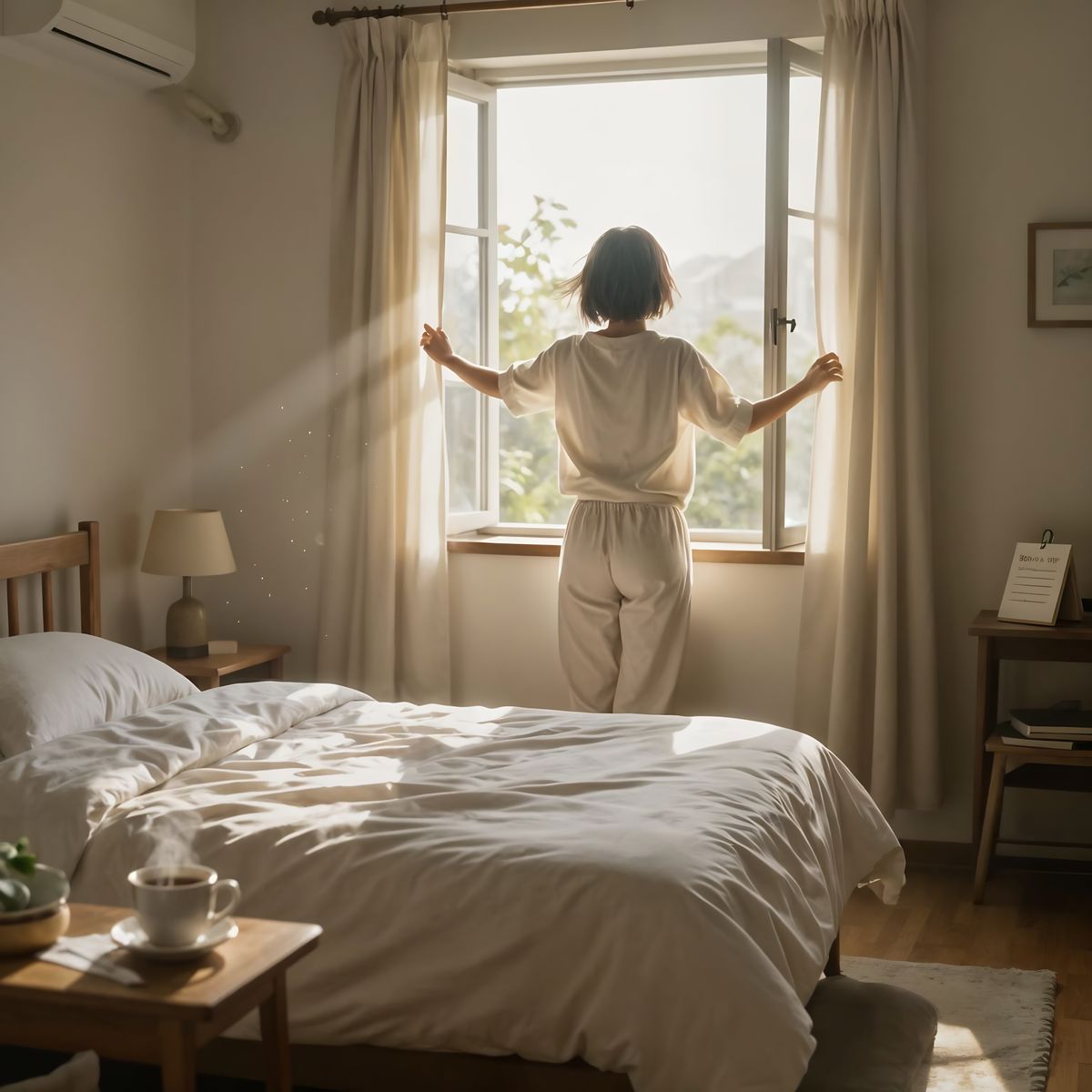 Early morning sunlight entering a calm bedroom, person in light running clothes standing by an open window, fresh air flowing in, neatly made bed, small table with a steaming cup of coffee and a handwritten New Year’s resolution list, soft curtains glowing, dust motes in light beams, clean natural palette, ...