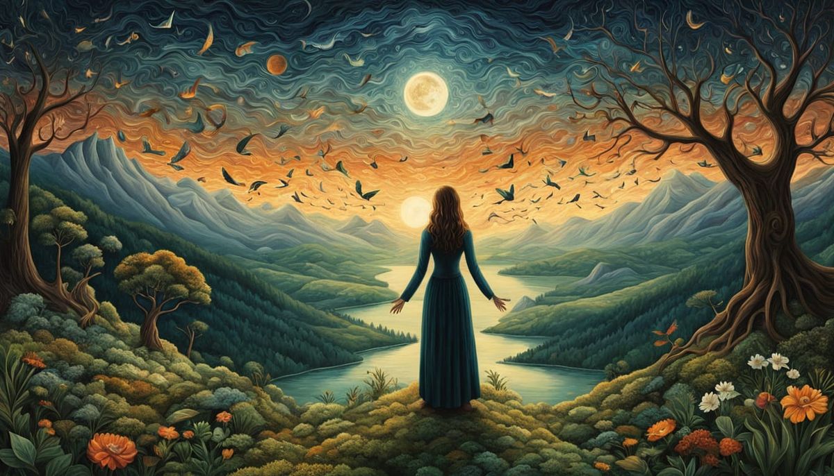 This digital artwork is a vibrant collage of Bio Art elements, featuring a central figure surrounded by a diverse array of textured patterns, serene nature scenes, and abstract designs, symbolizing strength, resilience, and the pursuit of authenticity in a chaotic world.