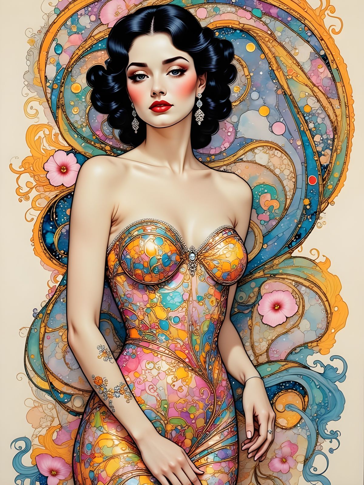 A striking picture of a full-bodied dancer with elegant hands, rendered in the Suminagashi ink marbling style. The artwork features pearlescent effects and a retro, pin-up aesthetic.