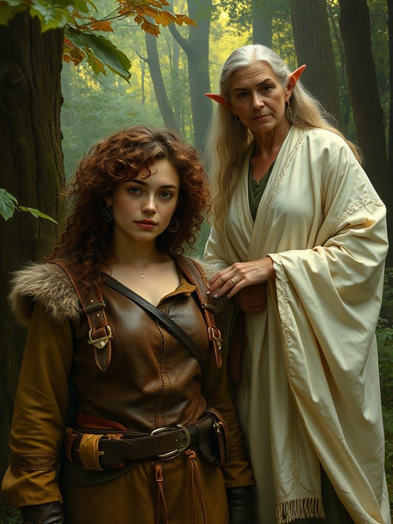 Female Hobbit with perfect curly brown hair, huge bosom, tan complexion, Standing next to a beautiful older female elf with extremely huge bosom that is dressed in a flowing white wrap garment, forest, detailed matte painting, deep color, fantastical, intricate detail, splash screen, complementary colors, ...