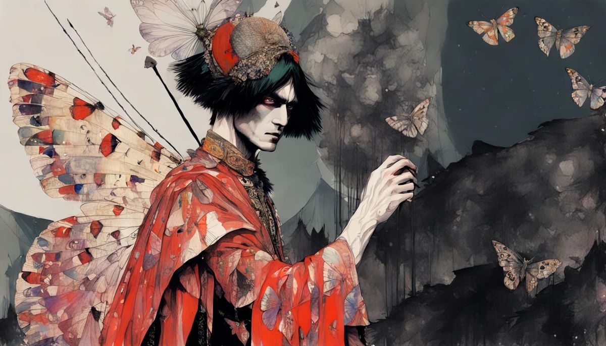 A striking picture of a handsome moth man warrior wearing ornate clothing. The image blends art nouveau illustration with flowing watercolor techniques against a detailed backdrop.