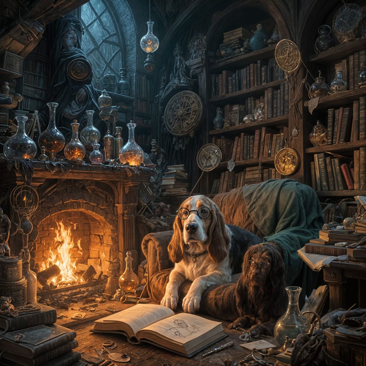 This image depicts a warm, cluttered wizard's study featuring overflowing bookshelves, bubbling potions, and magical artifacts. A bespectacled basset hound relaxes by a fireplace with a spellbook, rendered in atmospheric realism.