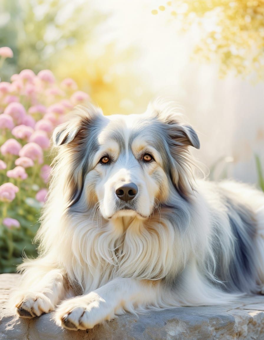 A photorealistic image of a shaggy dog on a stone patio, with a busy bee on its nose, set against a soft, airy pastel background, capturing a warm and inviting atmosphere.