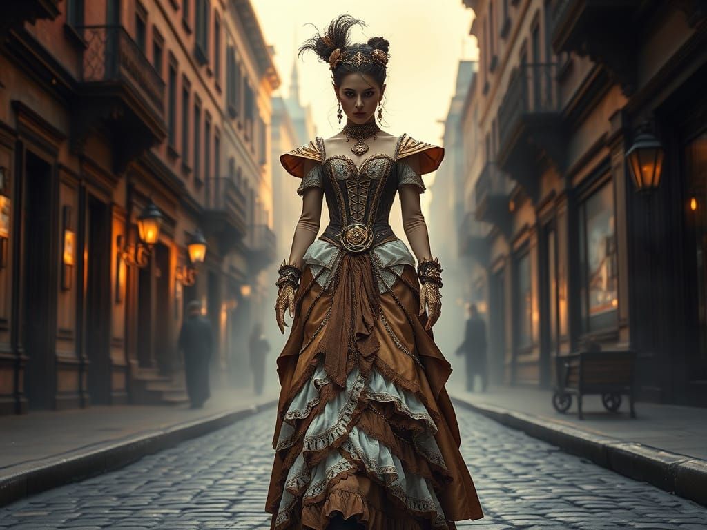 This image shows a regal vampire princess walking into a misty, cobblestone street, surrounded by the warm glow of a Victorian-era cityscape. The intricate, layered dress features brass accents and a leather corset, set against a backdrop of deep, muted colors and industrial textures.