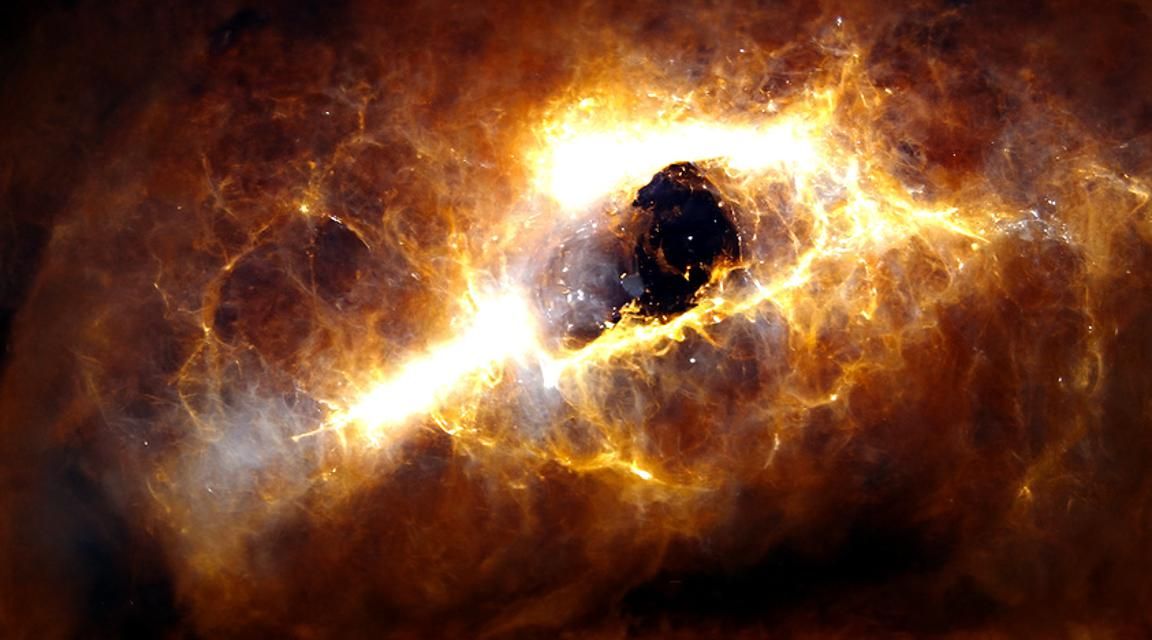 A cosmic spectacle showing a molten gold orb transforming into a galaxy. This captivating image features a black hole amidst a vibrant nebula, reminiscent of Hubble and Webb imagery.