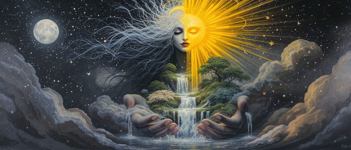 A digital painting of a giant goddess in a meditative pose holding a vibrant landscape in her hands. The artwork features celestial elements, runes, and lush natural details, rendered as fine art.
