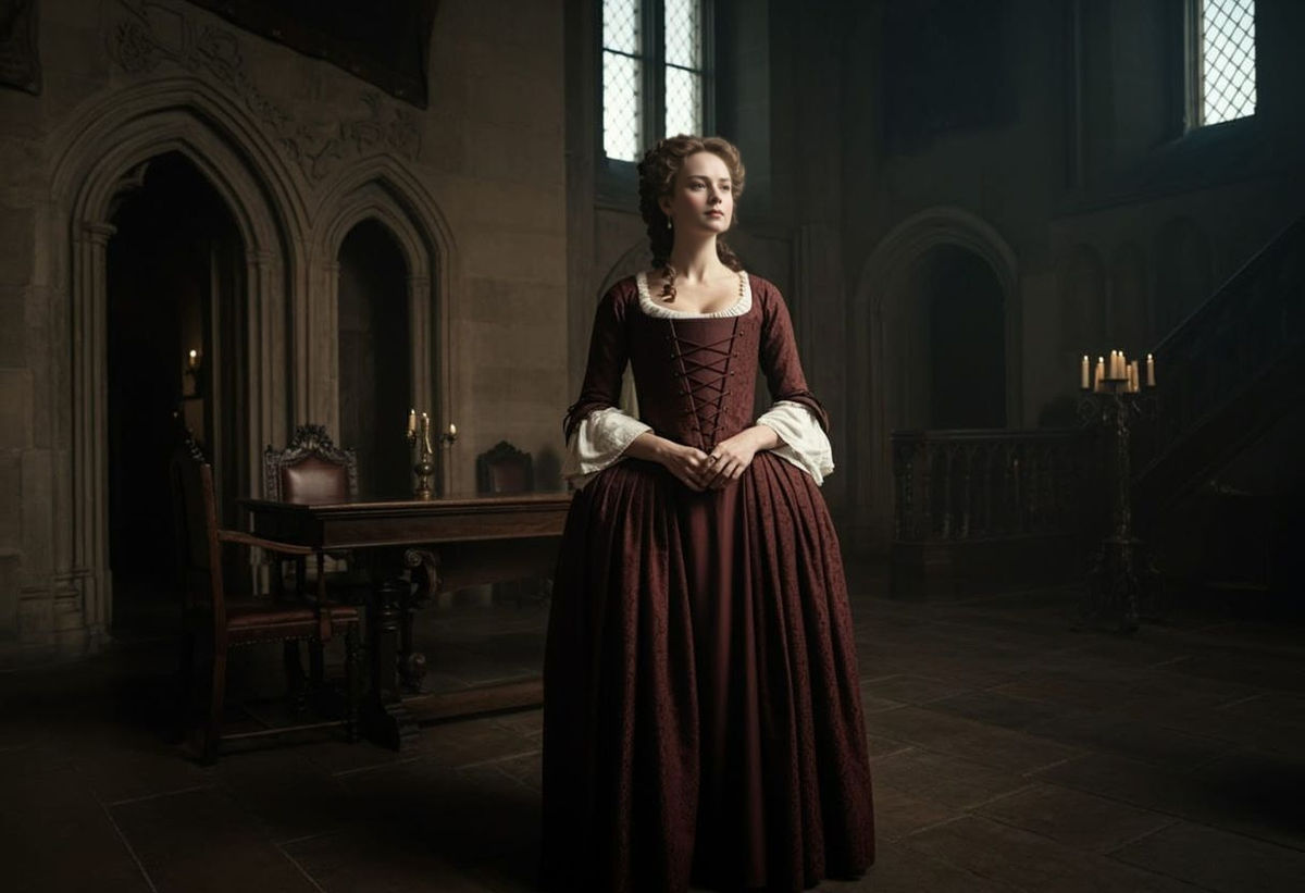 Full-length shot of a breathtakingly beautiful 18th-century Scottish noblewoman wearing historically accurate 1743 Scottish women's clothing in muted dark red and dark blue tones, A crisp linen shift peeks out subtly at the neckline and cuffs, completing the ensemble. The intricate details of her embroidered ...