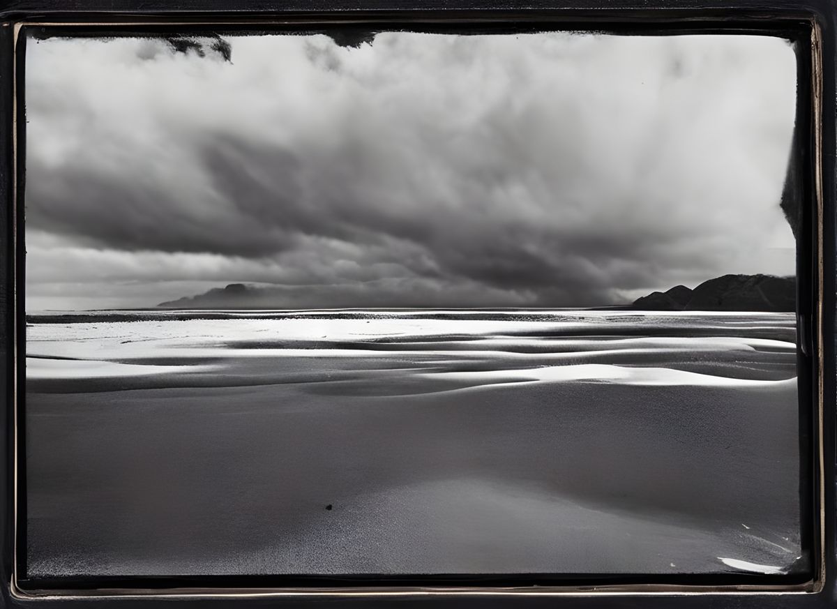 A striking picture of glittering black sand dunes under a fluffy cloud sky. The image is presented with an ambrotype aesthetic.