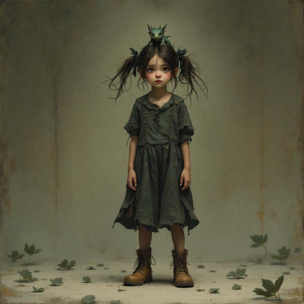 A dreamy young girl with pigtails and dragons in a muted, textured landscape. This detailed matte painting features intricate details and complementary colors in the style of concept art.